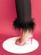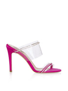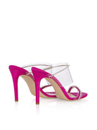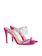 Mules with wide front pvc crystals embellished straps and spike heel.