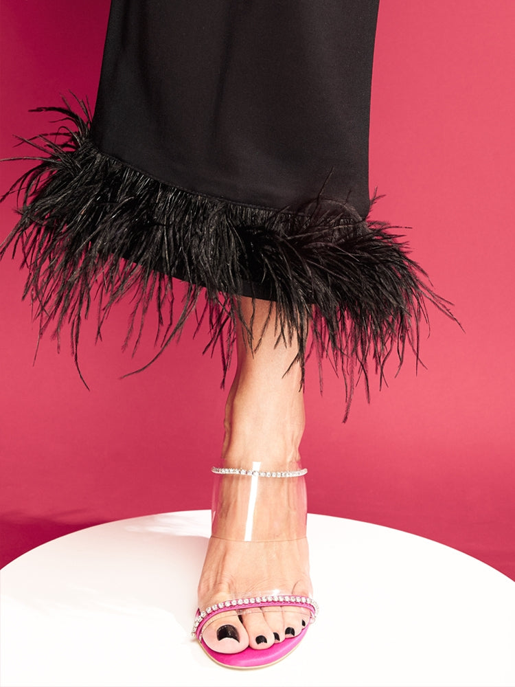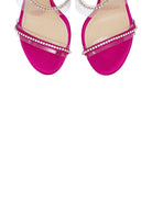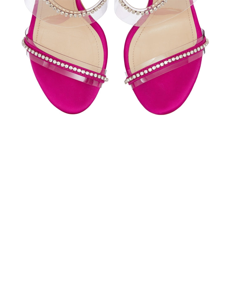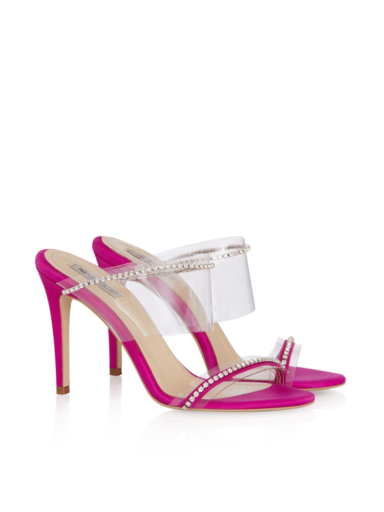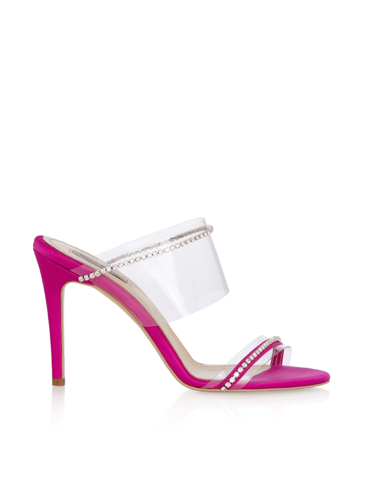 Picture: fuchsia satin, pvc, crystals; heel height 9cm.